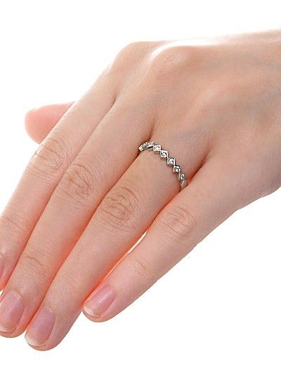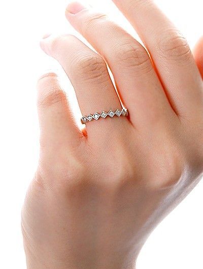 • 男性用は正方形をぐるりと一周連ねたシャープなデザイン。女性用はモザイクのような9個のスクエアシェイプの枠の中に、ブリリアントカット・ダイヤモンドを1つずつセットしました。