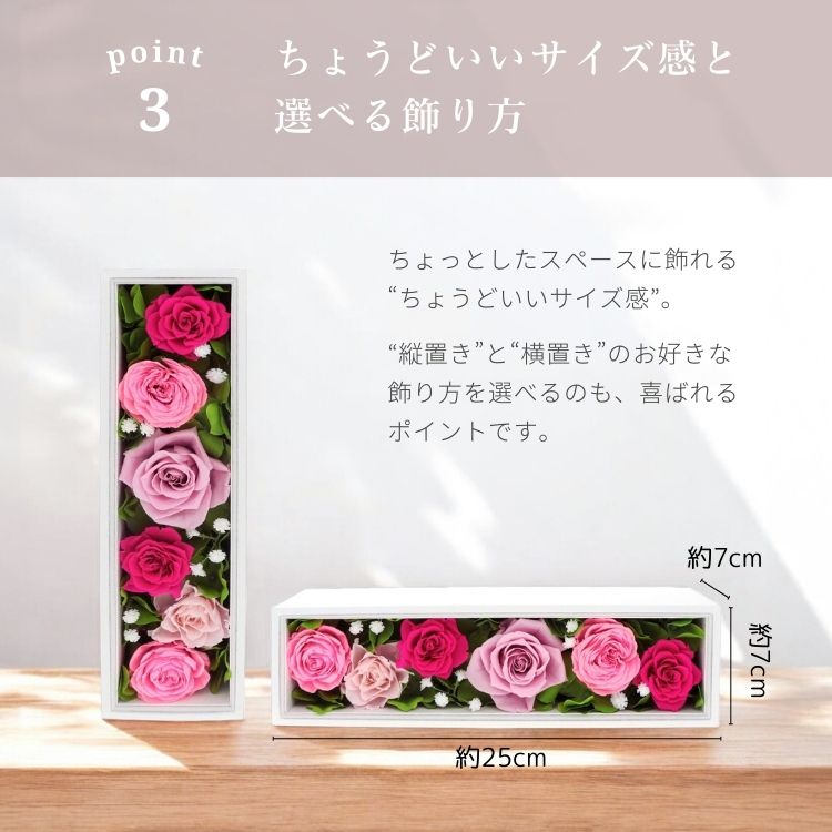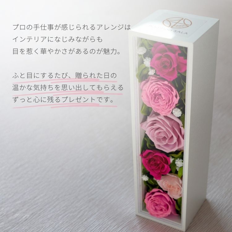 スリムなボックス入りデザインだから、リビングや玄関に気軽に飾れて、毎日ふとした瞬間に癒されます。