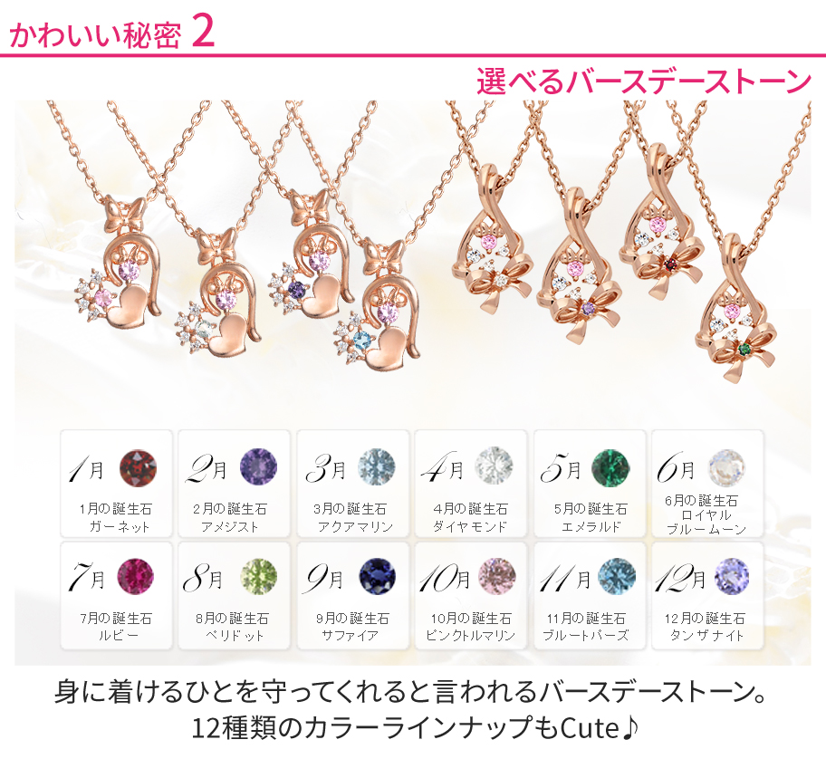 - キュービックジルコニア、ピンクトルマリン、タンザナイト(12月誕生石)、トパーズ(11月誕生石)、サファイア(9月誕生石)、ペリドット(8月誕生石)、ルビー(7月誕生石)、ムーンストーン(6月誕生石)、エメラルド(5月誕生石)、ダイヤモンド(4月誕生石)、アクアマリン(3月誕生石)、アメジスト(2月誕生石)、ガーネット(1月誕生石)