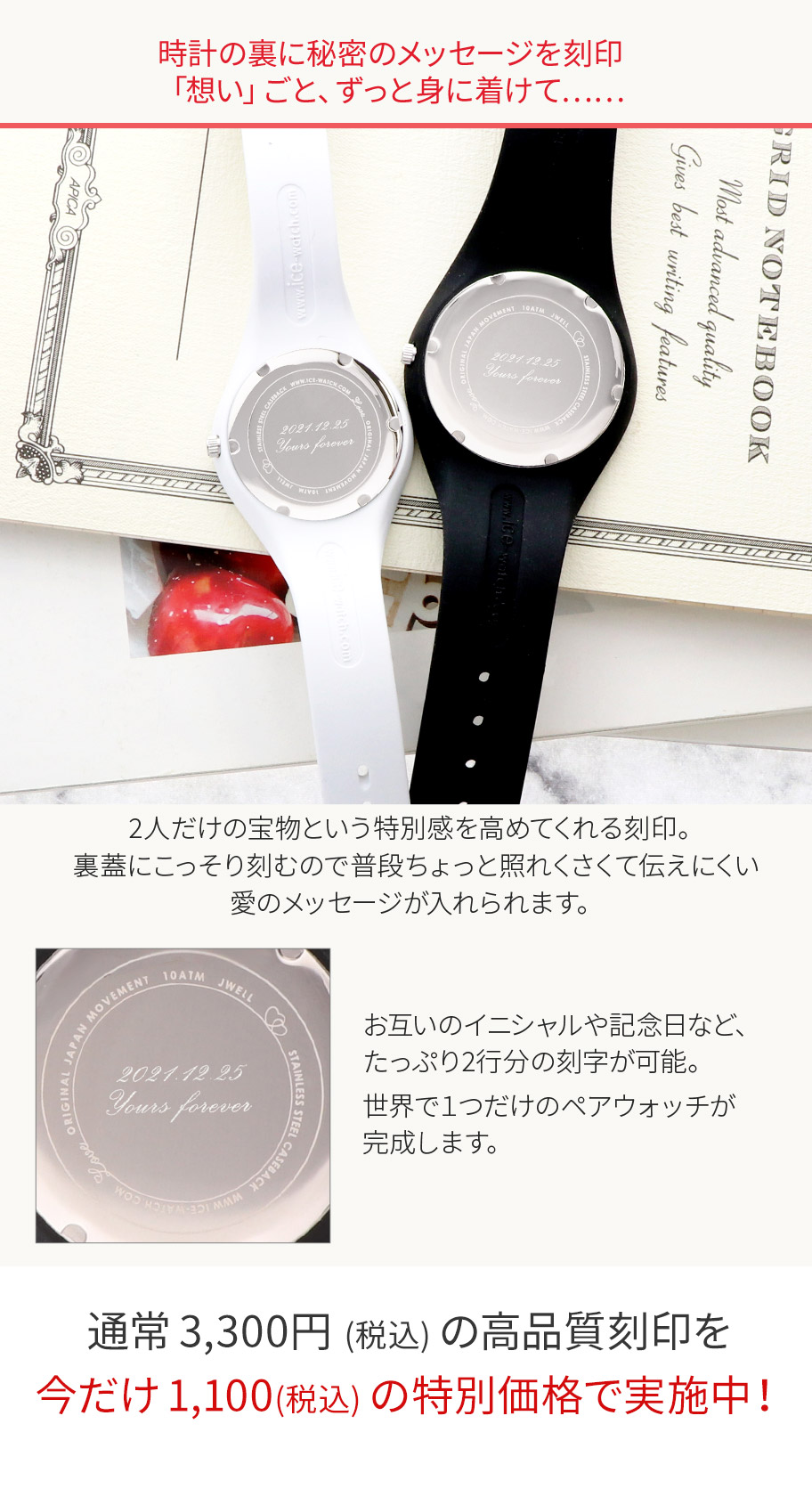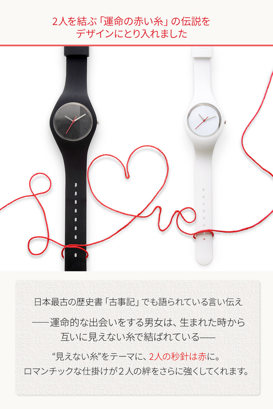 2人だけの刻印を刻めたり、赤い糸をイメージさせる赤い秒針をデザインしたり、特別なしかけが2人をつなぎます。