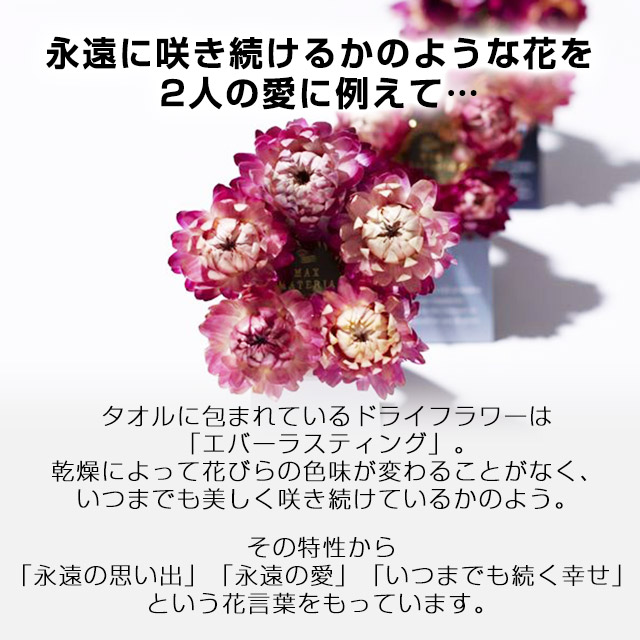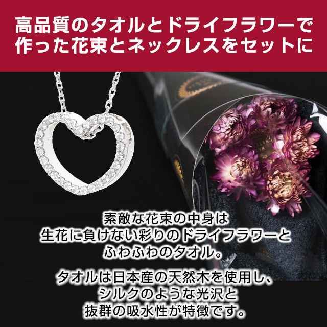 高品質のタオルとドライフラワーで作ったふわふわの花束とネックレスをセットに