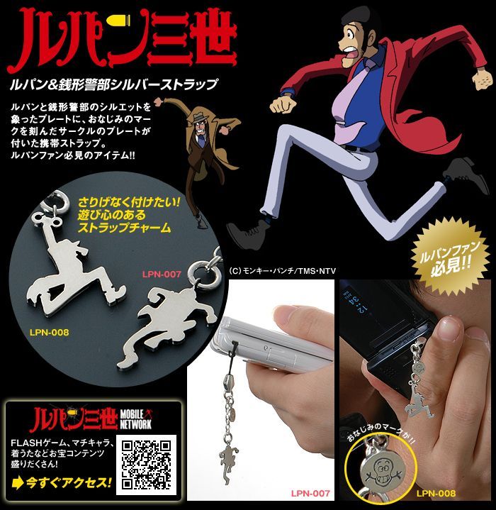 ルパンのシルエットに象ったプレートとサークルのプレートにあのマークを刻んだストラップです。