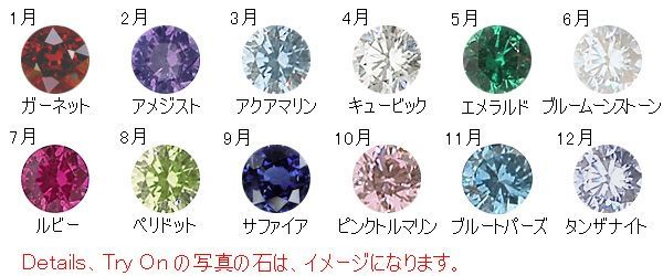 - キュービックジルコニア、ピンクトルマリン、タンザナイト(12月誕生石)、トパーズ(11月誕生石)、サファイア(9月誕生石)、ペリドット(8月誕生石)、ルビー(7月誕生石)、ムーンストーン(6月誕生石)、エメラルド(5月誕生石)、アクアマリン(3月誕生石)、アメジスト(2月誕生石)、ガーネット(1月誕生石)