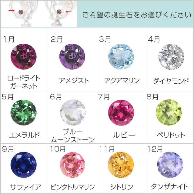 - ピンクトルマリン、タンザナイト(12月誕生石)、シトリン(11月誕生石)、サファイア(9月誕生石)、ペリドット(8月誕生石)、ルビー(7月誕生石)、ムーンストーン(6月誕生石)、エメラルド(5月誕生石)、ダイヤモンド(4月誕生石)、アクアマリン(3月誕生石)、アメジスト(2月誕生石)、ガーネット(1月誕生石)