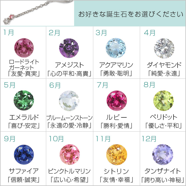 - キュービックジルコニア、ピンクトルマリン、タンザナイト(12月誕生石)、シトリン(11月誕生石)、サファイア(9月誕生石)、ペリドット(8月誕生石)、ルビー(7月誕生石)、ムーンストーン(6月誕生石)、エメラルド(5月誕生石)、ダイヤモンド(4月誕生石)、アクアマリン(3月誕生石)、アメジスト(2月誕生石)、ガーネット(1月誕生石)