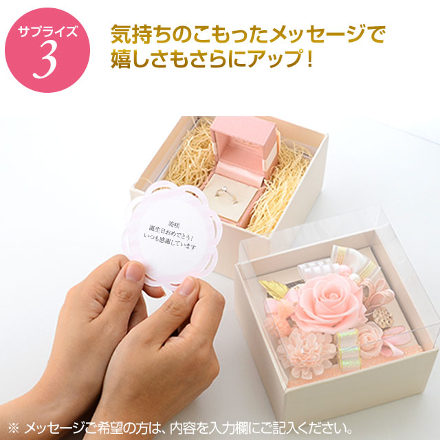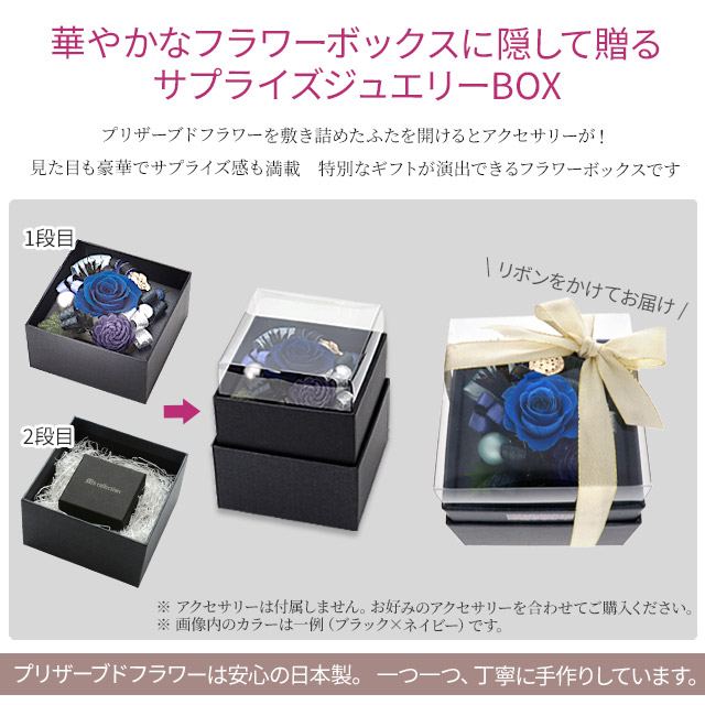 プリザーブドフラワーを敷き詰めたボックスの下にジュエリーをセットして贈ることができる