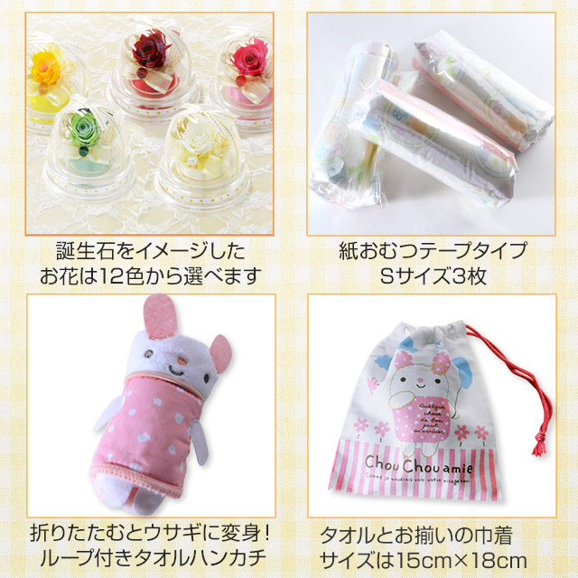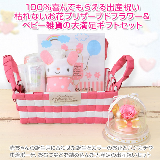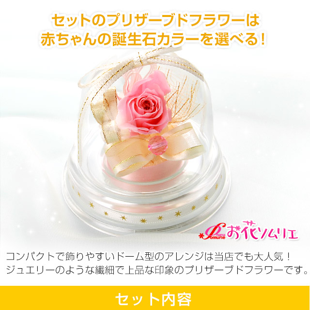 誕生石カラーのプリザーブドフラワーとベビー雑貨をセットにしたギフト詰め合わせ。