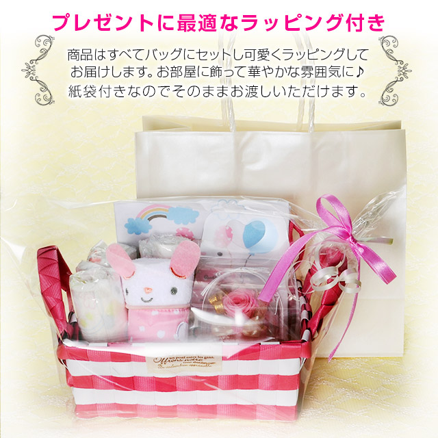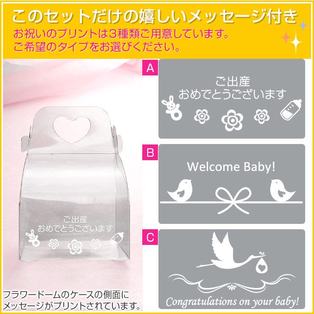 華やかなプリザーブドフラワーと便利なベビー用品を一緒にプレゼントできる出産祝いに最適なセットです。