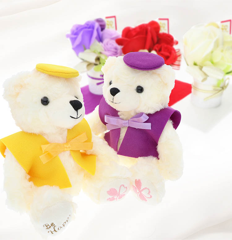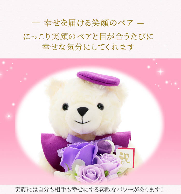 ベアは、「古希」「喜寿」「卒寿」のお祝いに相応しい紫色のベストと帽子を着ています。
