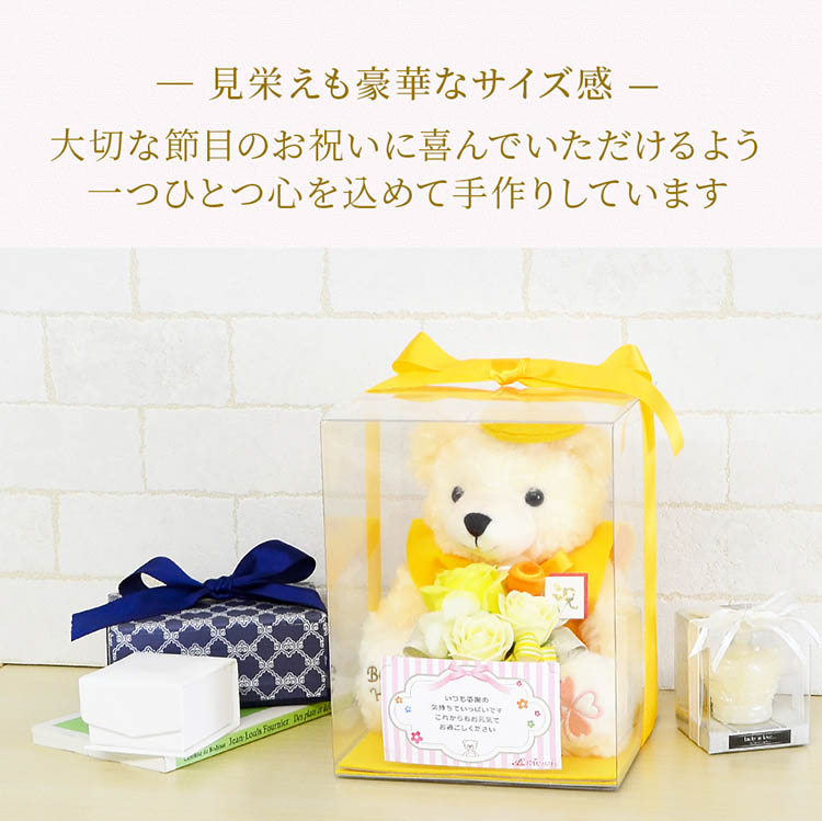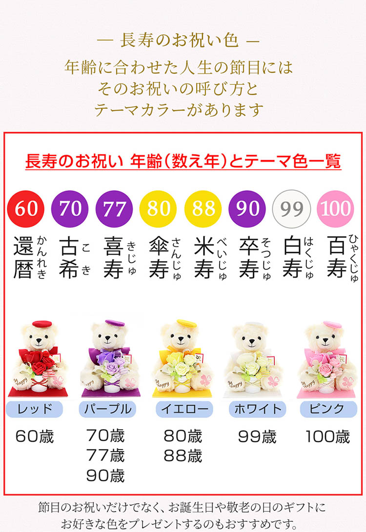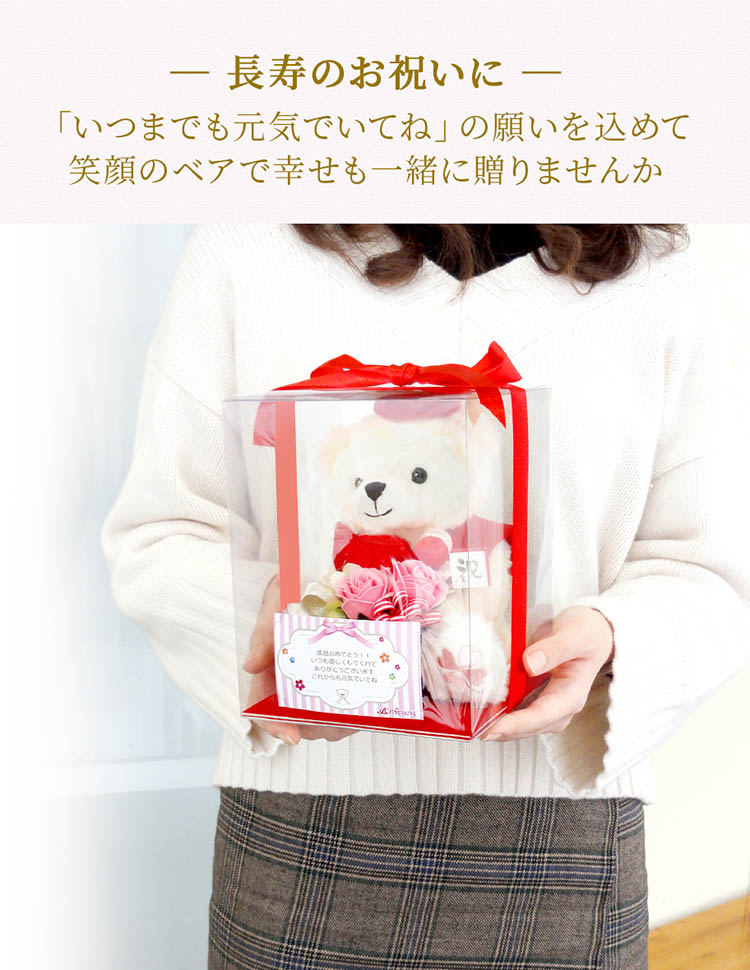 70歳 【古希】 77歳 【喜寿】 90歳 【卒寿】 ご長寿のお祝いに、ベアのぬいぐるみとお花がセットになった、色鮮やかな姿が長く楽しめるソープフラワーギフト。