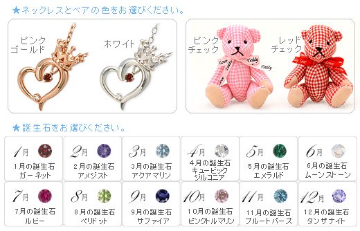 - キュービックジルコニア、ピンクトルマリン、タンザナイト(12月誕生石)、トパーズ(11月誕生石)、サファイア(9月誕生石)、ペリドット(8月誕生石)、ルビー(7月誕生石)、ムーンストーン(6月誕生石)、エメラルド(5月誕生石)、アクアマリン(3月誕生石)、アメジスト(2月誕生石)、ガーネット(1月誕生石)