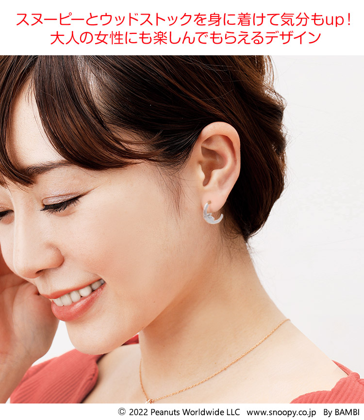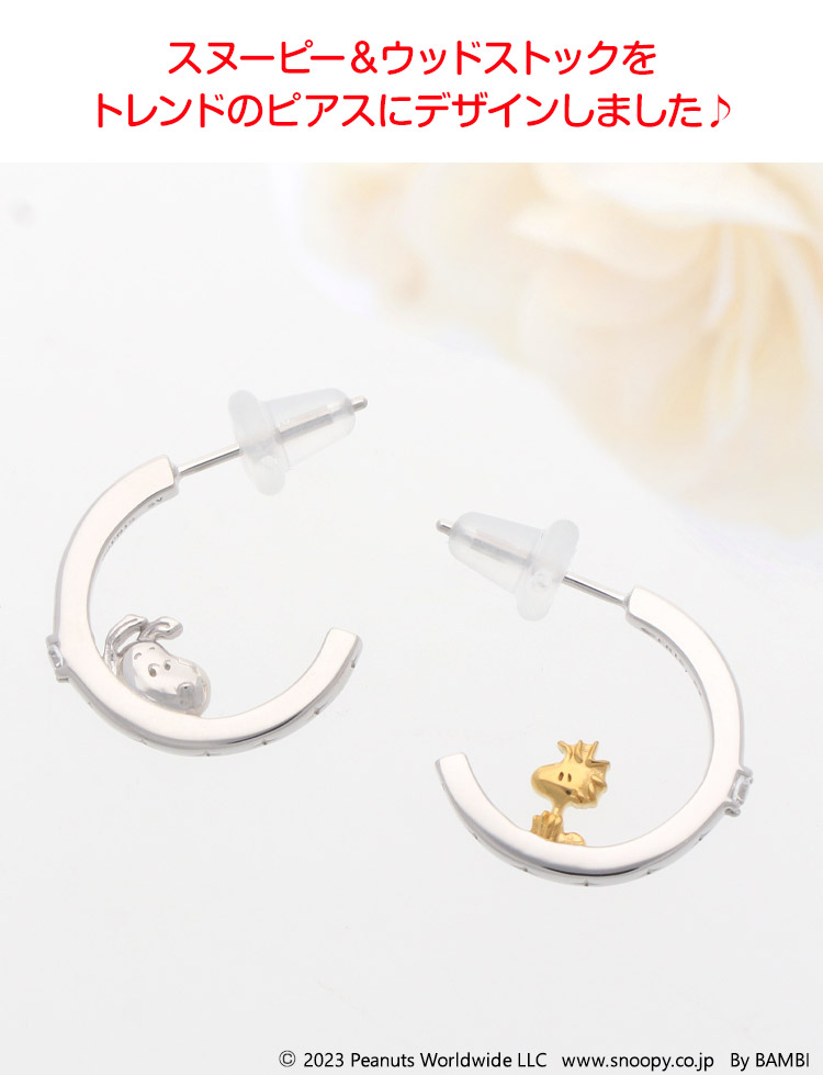 フープピアスの端にスヌーピーの顔とウッドストックが乗っているようにデザインされたかわいらしいピアス。片方がスヌーピー、片方がウッドストックになっています。ピアスの正面には煌めくストーンをセットしました。スヌーピー好きの彼女へのプレゼントにもおすすめです。