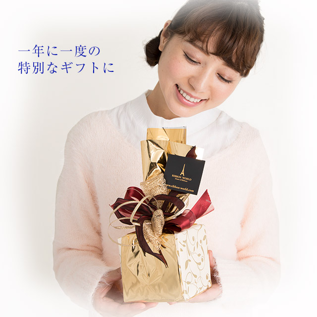 ゴールドにボルドーのリボンで高級感あるギフトシーンを演出。