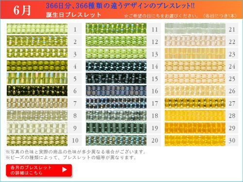 6月の誕生日ブレスレットは若葉のようなグリーン系、キャンディのような透明感が美しいイエロー系、