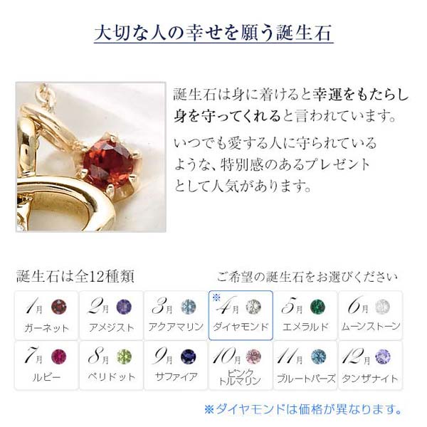 - ピンクトルマリン、タンザナイト(12月誕生石)、トパーズ(11月誕生石)、サファイア(9月誕生石)、ペリドット(8月誕生石)、ルビー(7月誕生石)、ムーンストーン(6月誕生石)、エメラルド(5月誕生石)、アクアマリン(3月誕生石)、アメジスト(2月誕生石)、ガーネット(1月誕生石)