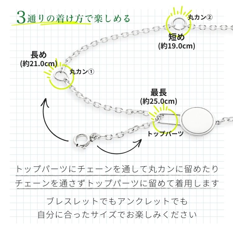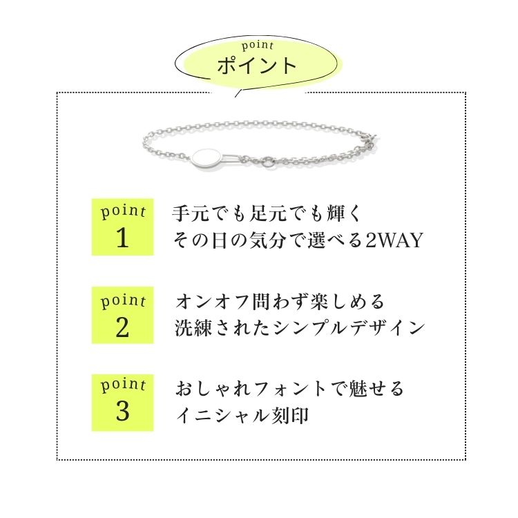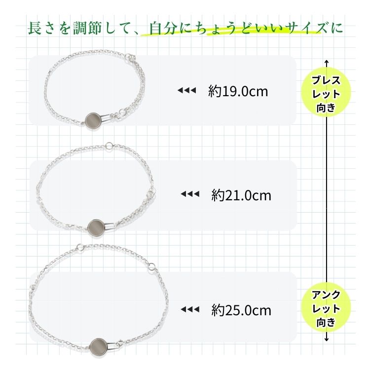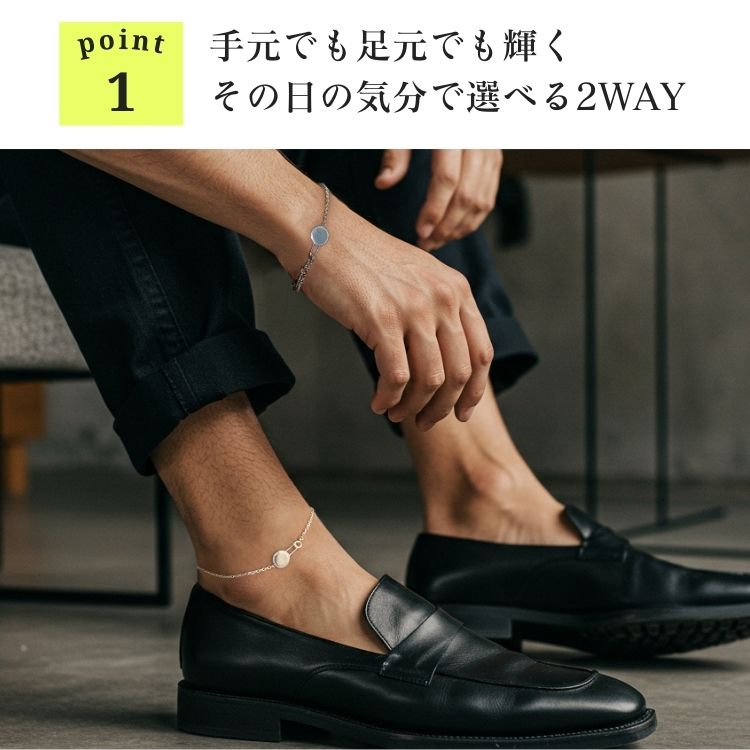 ブレスレットにもアンクレットにもなる便利な2wayアイテム。