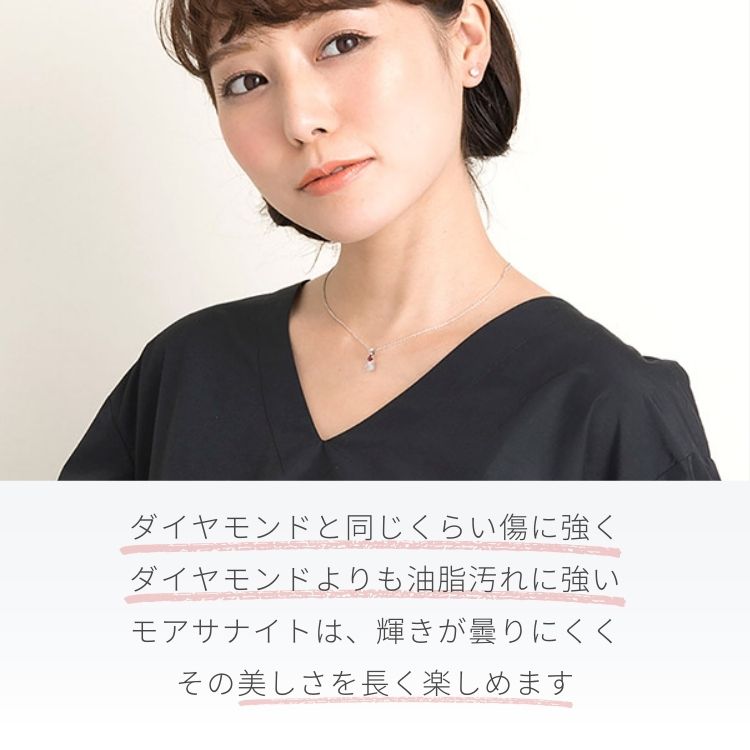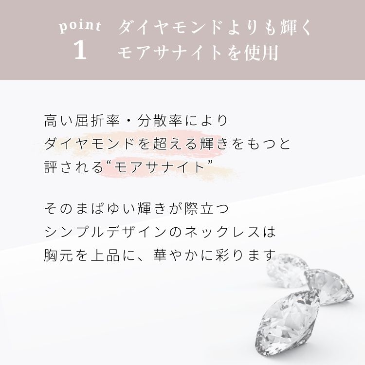 宝石の輝きをつくる屈折率、煌めきをあらわす分散率が高い数値を誇り、ダイヤモンドを超える輝きとも評されるモアサナイトのネックレス。