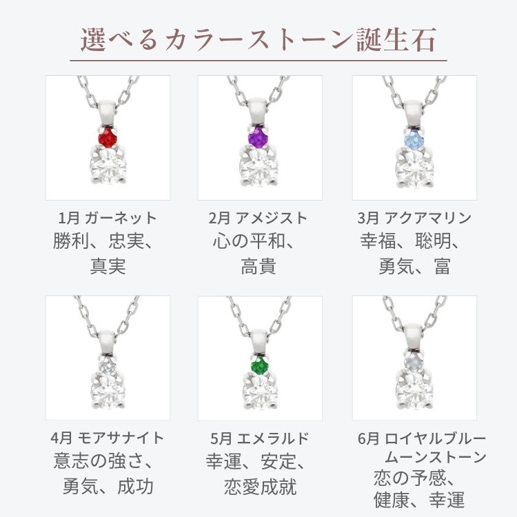 - ピンクトルマリン、タンザナイト(12月誕生石)、シトリン(11月誕生石)、サファイア(9月誕生石)、ペリドット(8月誕生石)、ルビー(7月誕生石)、ムーンストーン(6月誕生石)、エメラルド(5月誕生石)、アクアマリン(3月誕生石)、アメジスト(2月誕生石)、ガーネット(1月誕生石)