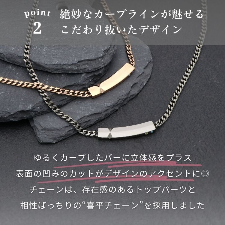 喜平チェーンに馴染むようゆるやかにカーブを描くペンダントトップがスタイリッシュなネックレス。