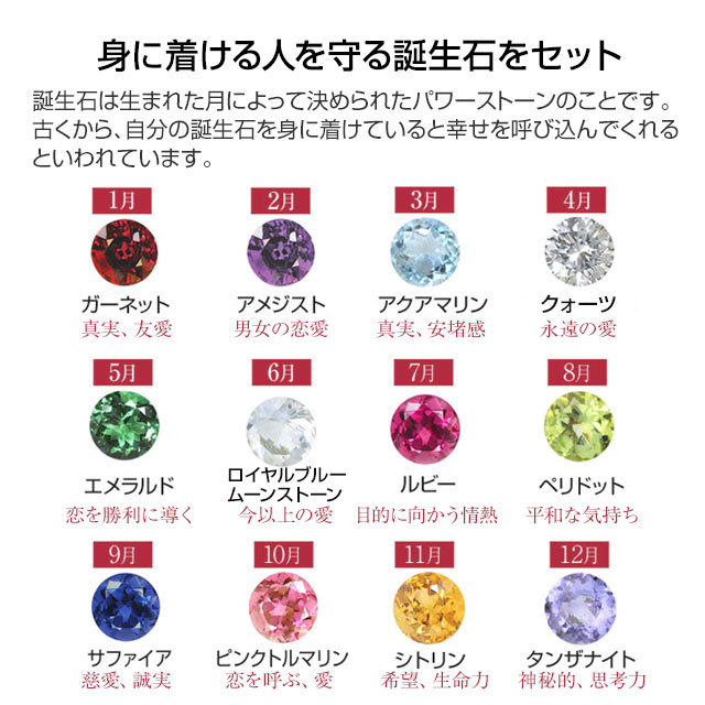 - ピンクトルマリン、タンザナイト(12月誕生石)、シトリン(11月誕生石)、サファイア(9月誕生石)、ペリドット(8月誕生石)、ルビー(7月誕生石)、ムーンストーン(6月誕生石)、エメラルド(5月誕生石)、アクアマリン(3月誕生石)、アメジスト(2月誕生石)、ガーネット(1月誕生石)