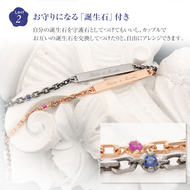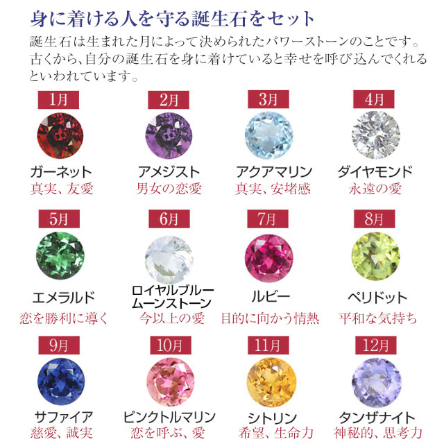 - ピンクトルマリン、タンザナイト(12月誕生石)、シトリン(11月誕生石)、サファイア(9月誕生石)、ペリドット(8月誕生石)、ルビー(7月誕生石)、ムーンストーン(6月誕生石)、エメラルド(5月誕生石)、ダイヤモンド(4月誕生石)、アクアマリン(3月誕生石)、アメジスト(2月誕生石)、ガーネット(1月誕生石)