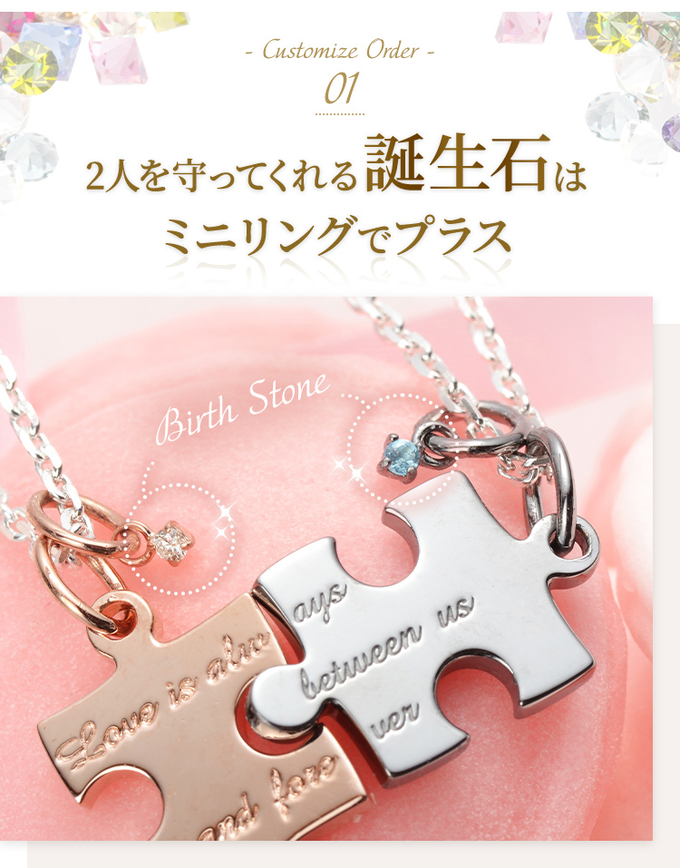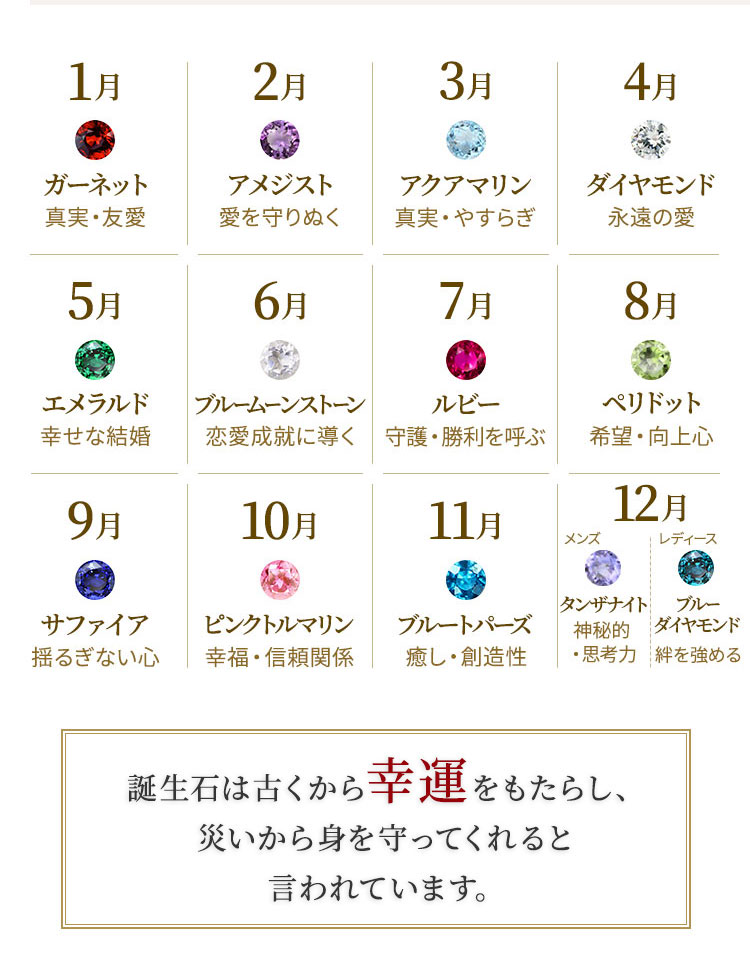 - ピンクトルマリン、トパーズ(11月誕生石)、サファイア(9月誕生石)、ペリドット(8月誕生石)、ルビー(7月誕生石)、ムーンストーン(6月誕生石)、エメラルド(5月誕生石)、ダイヤモンド(4月誕生石)、アクアマリン(3月誕生石)、アメジスト(2月誕生石)、ガーネット(1月誕生石)
