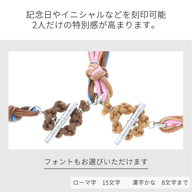 メンズはナチュラルブラウンのレザーにブルーのコード・レディースはナチュラルベージュのレザーにピンクのコードを合わせ、カラーが際立ち明るい印象。
