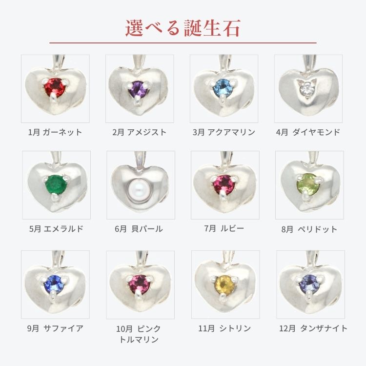 - タンザナイト(12月誕生石)、シトリン(11月誕生石)、トルマリン(10月誕生石)、サファイア(9月誕生石)、ペリドット(8月誕生石)、ルビー(7月誕生石)、パール(6月誕生石)、エメラルド(5月誕生石)、ダイヤモンド(4月誕生石)、アクアマリン(3月誕生石)、アメジスト(2月誕生石)、ガーネット(1月誕生石)