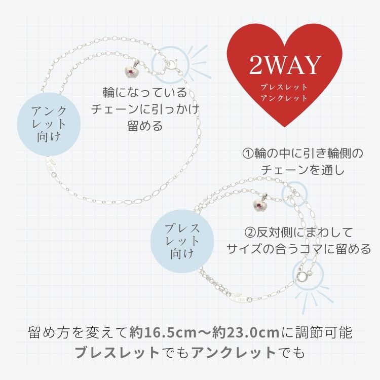 チェーンの通し方を変えて長さを調整し、ブレスレットとアンクレット兼用でご使用いただけます。